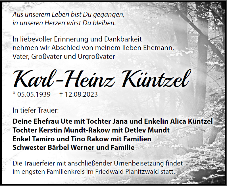 wir wünschen Ihnen von Herzen viel Kraft, dass Sie Menschen um sich haben, die Ihnen in dieser schweren Zeit beistehen und Halt geben. Zusätzlich können Sie auf dieser Gedenkseite Erinnerungen teilen und so das Andenken gemeinsam wachhalten.